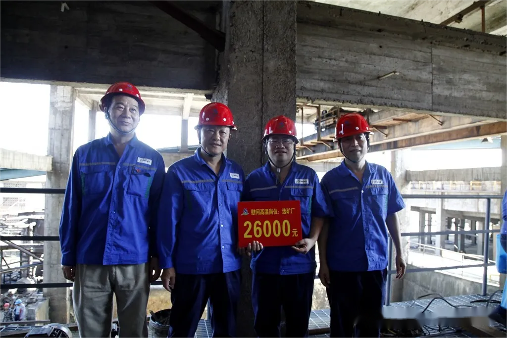 7月30日上午,礦業(yè)公司黨政領(lǐng)導(dǎo)班子分3組分別到選礦廠、露天礦、綜合保障部、技術(shù)中心、工程工區(qū)全尾充填等生產(chǎn)崗位慰問,為高溫堅(jiān)守崗位的員工送上礦泉水、飲料、毛巾、香皂等防暑禮包,共計(jì)520份。